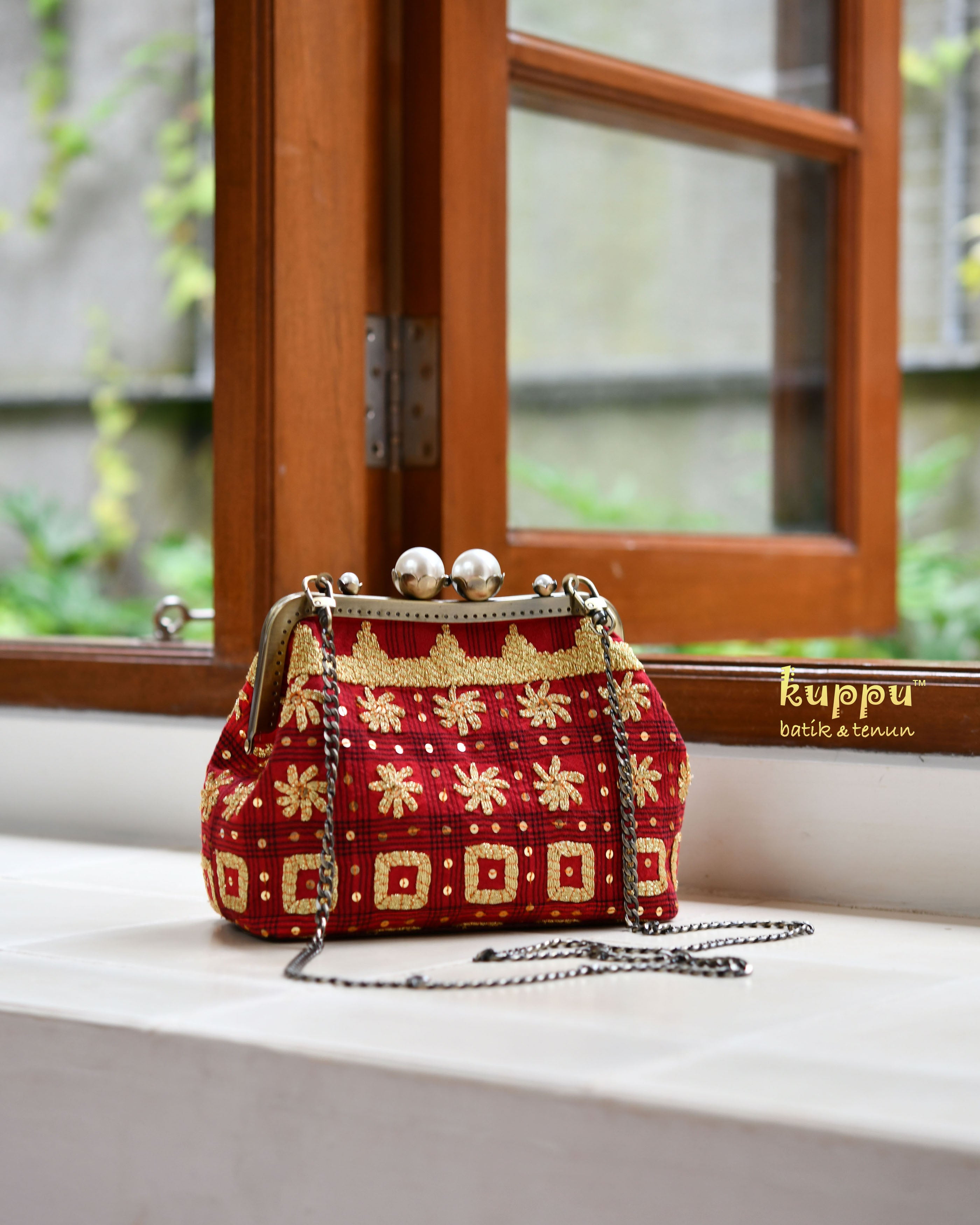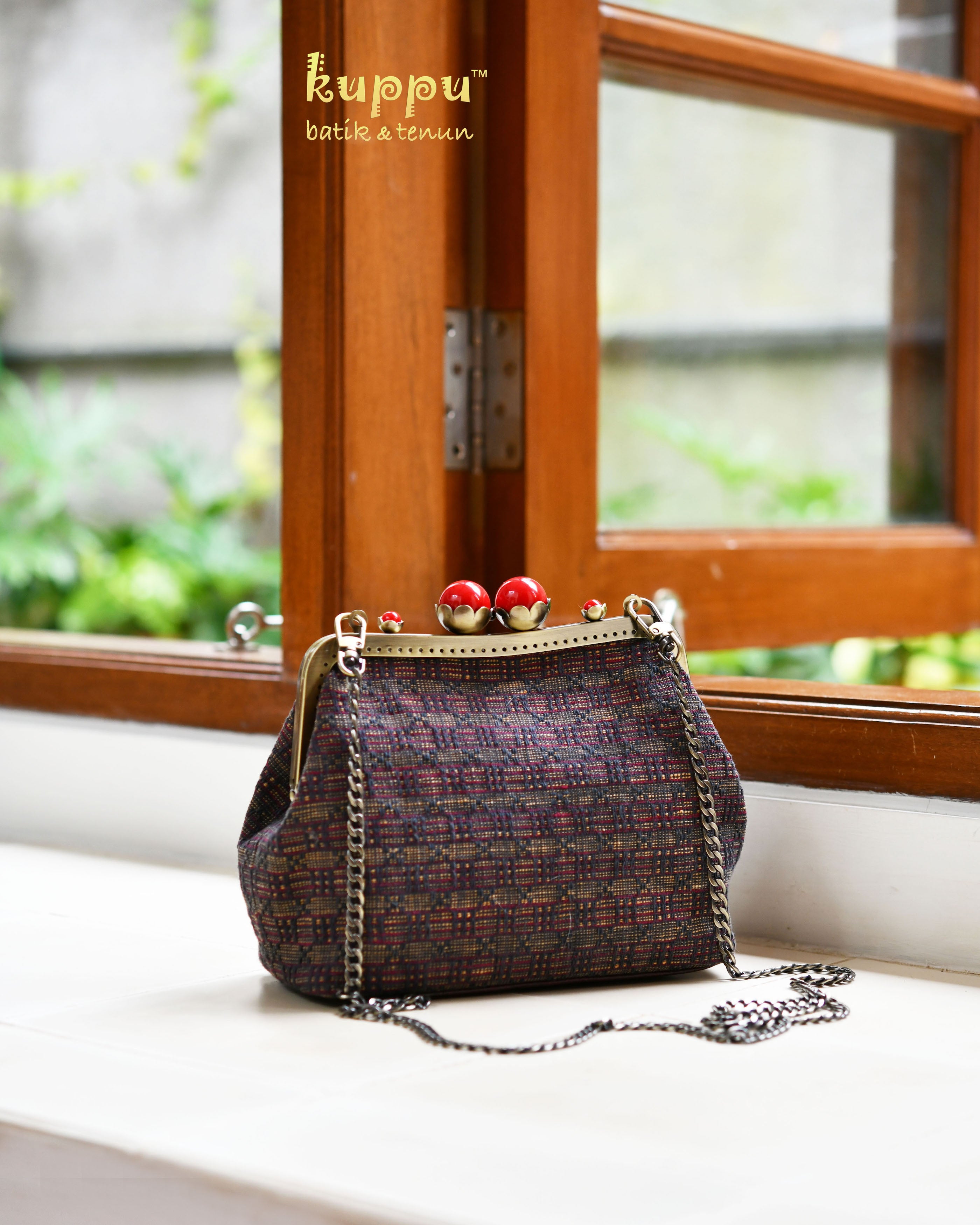Beautiful handwoven Tapis from Lampung, Sumatra - Indonesia Combined with maroon Italian cow leather. Mini size 22x16x10 cm (LxHxW) Eco-suede fabric lining Clasp closure Detachable chain long strap With Kuppu...