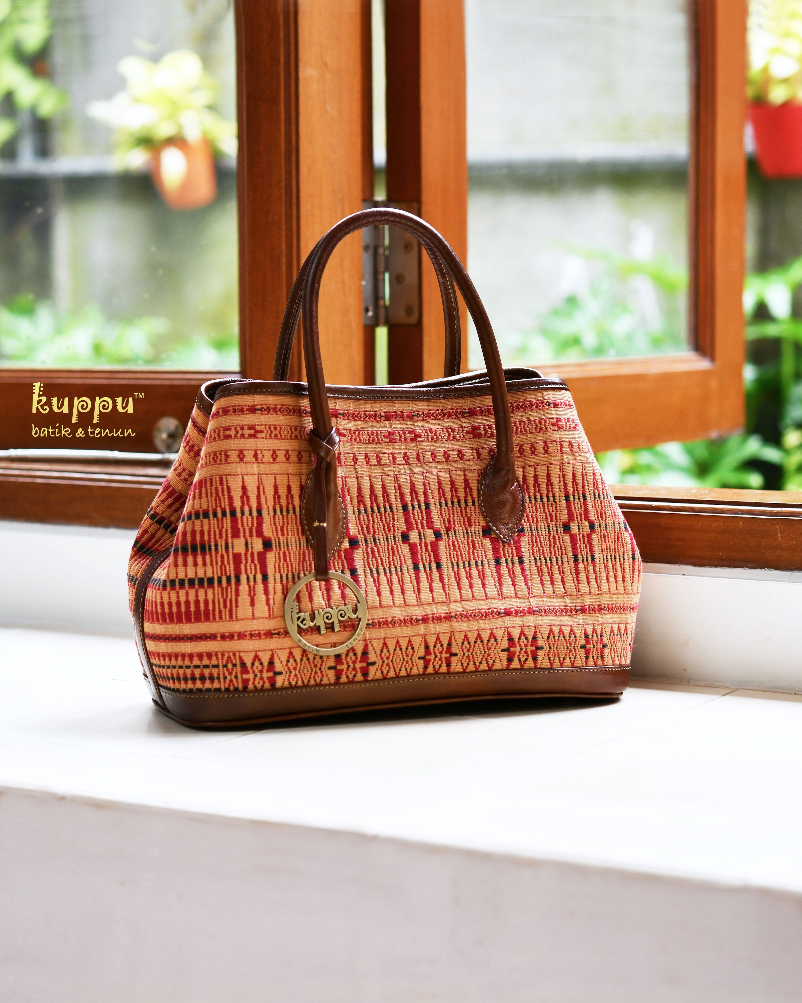 A beautiful natural-dyed Ulos Pucca from Tarutung North Sumatra, Indonesia Russet brown Italian cow leather Small size 30x21x13 cm (LxWxH) Eco-suede fabric lining Magnetic button closure Kuppu signature handbag tag...